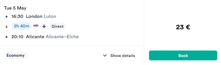 We’ve found flight deals from LONDON to ALICANTE from 23 EUR (direct flight).