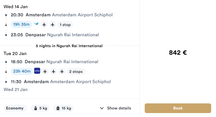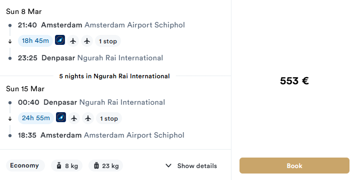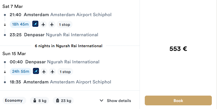 FLIGHTS FROM AMSTERDAM TO BALI (DENPASAR) 553 EUR (both ways, baggage included) We’ve found round-trip flight deals from AMSTERDAM to BALI (DENPASAR) with checked baggage included from 553 EUR (both ways).Prices depend on travel dates, airline and layovers. Check live availability in the search form below. ROUTE AMSTERDAM AIRPORT SCHIPHOL → DENPASAR → AMSTERDAM AIRPORT SCHIPHOL TRAVEL DATES Best availability:• 7 – 15 March – 553 EUR (both ways, 1 baggage included)• 8 – 15 March – 502 EUR (both ways, 1 baggage included)• 14 – 20 March – 842 EUR (both ways, 1 baggage included) SOME PRICE EXAMPLES BAGGAGE Most fares on this route include checked baggage (20 kg). Always verify baggage allowance on the final booking page. SEARCH & BOOK TOURS & EXCURSIONS Guided tours and excursions help you experience the destination beyond the beach —from cultural landmarks to nature and adventure activities.👉 Browse tours and activities: KLOOK.COM CAR RENTAL Renting a car in PHUKET is a convenient way to explore beaches, viewpoints and nearby attractions.Compare prices from international and local providers using the link below.👉 Rent a car: QEEQ GETRENTACAR.COM TRANSFER KIWITAXI GETTRANSFER.COM INTUI.TRAVEL WELCOME PICKUPS AFFILIATE DISCLOSURE This post contains affiliate links and tools. If you book through them, we may earn a commission at no extra cost to you.