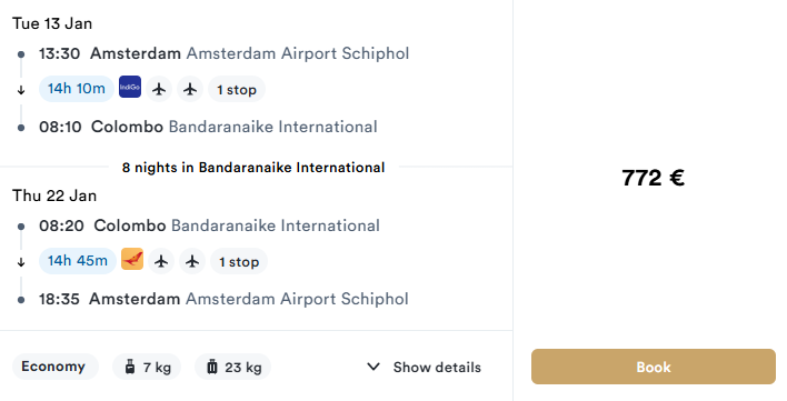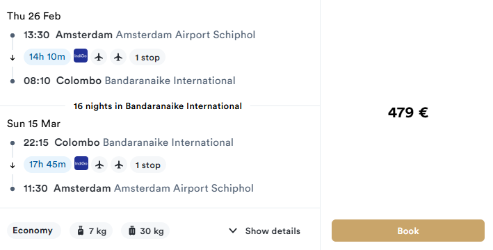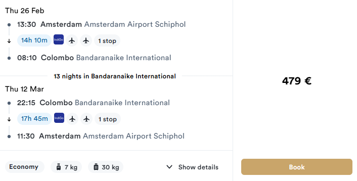 FLIGHTS FROM AMSTERDAM TO COLOMBO (SRI LANKA) 479 EUR (both ways, baggage included) We’ve found round-trip flight deals from AMSTERDAM to COLOMBO (SRI LANKA) with checked baggage included from 479 EUR (both ways).Prices depend on travel dates, airline and layovers. Check live availability in the search form below. ROUTE AMSTERDAM AIRPORT SCHIPHOL → COLOMBO BANDARANAIKE INTERNATIONAL → AMSTERDAM AIRPORT SCHIPHOL TRAVEL DATES Best availability:• 26 February – 15 March – 479 EUR (both ways, 1 baggage included)• 26 February – 12 March – 479 EUR (both ways, 1 baggage included)• 13 – 22 January – 772 EUR (both ways, 1 baggage included) SOME PRICE EXAMPLES BAGGAGE Most fares on this route include checked baggage (20 kg). Always verify baggage allowance on the final booking page. SEARCH & BOOK TOURS & EXCURSIONS Guided tours and excursions help you experience the destination beyond the beach —from cultural landmarks to nature and adventure activities.👉 Browse tours and activities: KLOOK.COM CAR RENTAL Renting a car in PHUKET is a convenient way to explore beaches, viewpoints and nearby attractions.Compare prices from international and local providers using the link below.👉 Rent a car: QEEQ GETRENTACAR.COM TRANSFER KIWITAXI GETTRANSFER.COM INTUI.TRAVEL WELCOME PICKUPS AFFILIATE DISCLOSURE This post contains affiliate links and tools. If you book through them, we may earn a commission at no extra cost to you. Add Your Heading Text Here