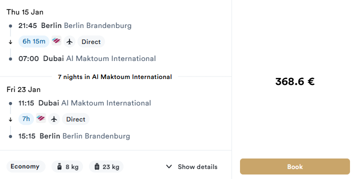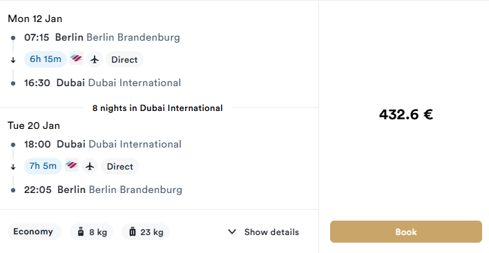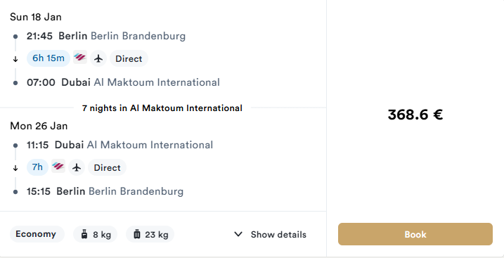 FLIGHTS FROM BERLIN TO DUBAI FROM 368 EUR (both ways, baggage included) We’ve found round-trip flight deals from BERLIN BRANDENBURG to DUBAI INTERNATIONAL with checked baggage included from 368 EUR.Prices depend on travel dates, airline and layovers. Check live availability in the search form below. ROUTE BERLIN BRANDENBURG → DUBAI INTERNATIONAL → BERLIN BRANDENBURG TRAVEL DATES Best availability:• 18 – 26 January – 368 EUR (both ways, 1 baggage included)• 15 – 23 January – 368 EUR (both ways, 1 baggage included)• 12 January – 20 January – 432 EUR (both ways, 1 baggage included) SOME PRICE EXAMPLES BAGGAGE Most fares on this route include checked baggage (20 kg). Always verify baggage allowance on the final booking page. SEARCH & BOOK TOURS & EXCURSIONS Guided tours and excursions help you experience the destination beyond the beach —from cultural landmarks to nature and adventure activities.👉 Browse tours and activities: KLOOK.COM CAR RENTAL Renting a car in PHUKET is a convenient way to explore beaches, viewpoints and nearby attractions.Compare prices from international and local providers using the link below.👉 Rent a car: QEEQ GETRENTACAR.COM TRANSFER KIWITAXI GETTRANSFER.COM INTUI.TRAVEL WELCOME PICKUPS AFFILIATE DISCLOSURE This post contains affiliate links and tools. If you book through them, we may earn a commission at no extra cost to you.